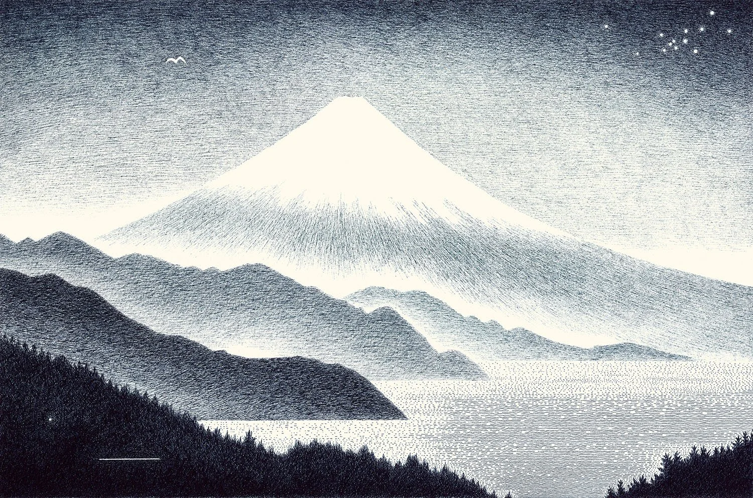 I only create my pieces using a blue-black ink. There’s something about this color that calms my mind, drawing me into a deep connection with the sea, the sky, and the vastness of the universe. I believe it resonates with the wavelength of Japan Blue, the indigo dye that has been cherished in Japan for centuries.